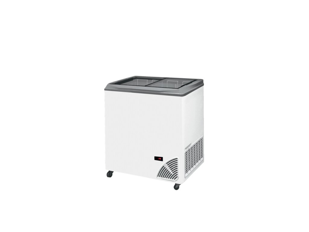 Spolehlivý prodejní mrazák 149 l. Rovné sklo pro top přehled, 2 koše, zámek a kolečka. Ideální pro efektivní, rychlý a bezpečný prodej!