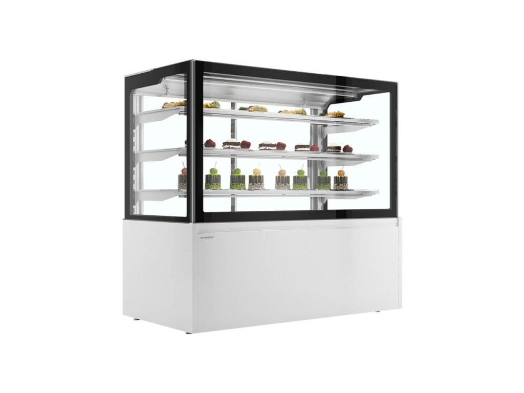 Prostorná profi vitrína (1,45 m²) s rovným sklem. 4 plně chlazené police a precizní teplota (+1 až +5 °C) pro luxusní prezentaci dezertů.
