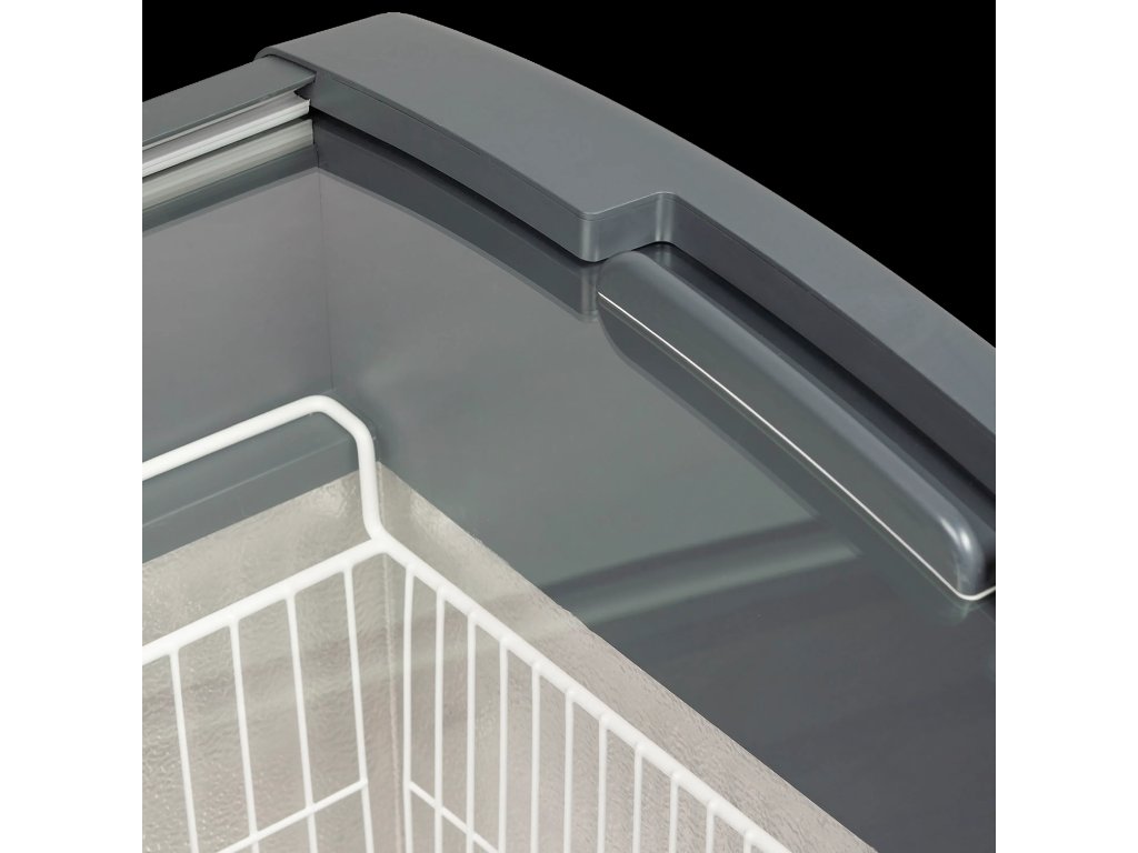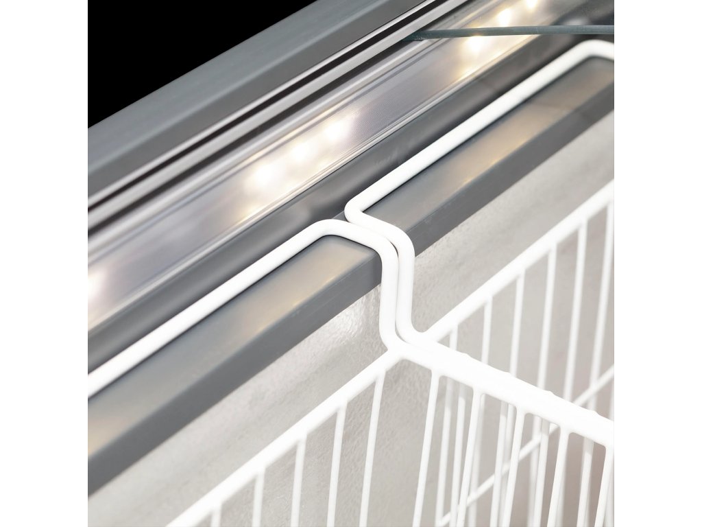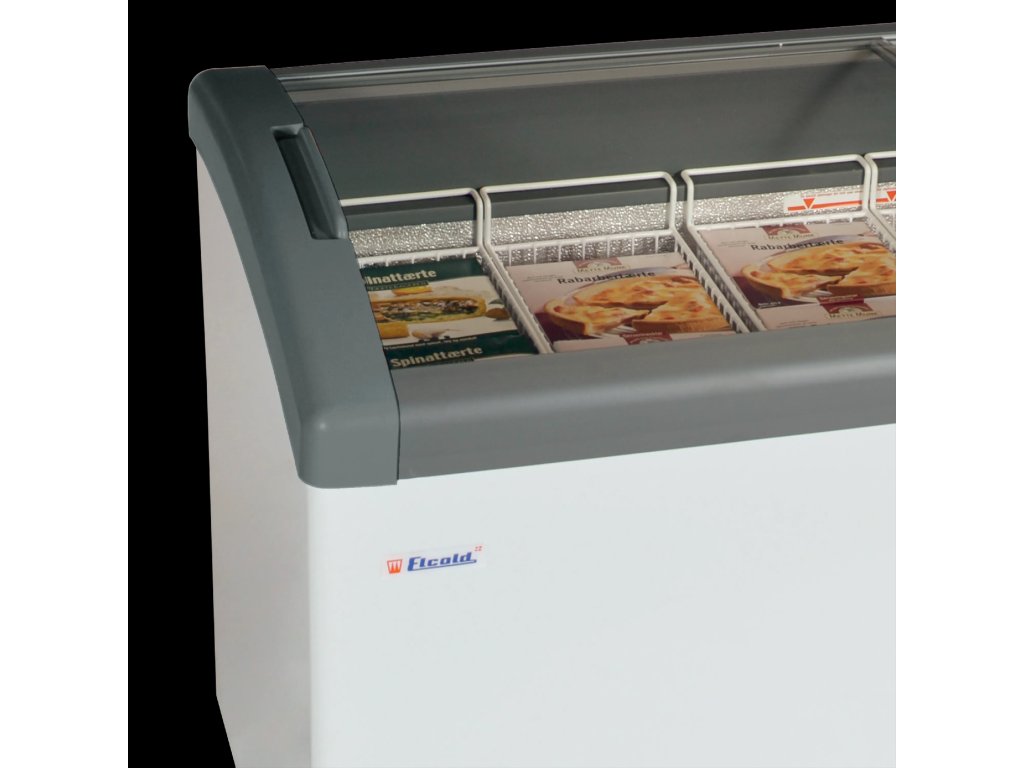 Nepřehlédnutelný design I přes svou velikost si mrazák zachovává elegantní vzhled. Kombinace oblých prosklených vík a výkonného LED osvětlení zaručuje, že vaše nabídka bude vždy v centru pozornosti.