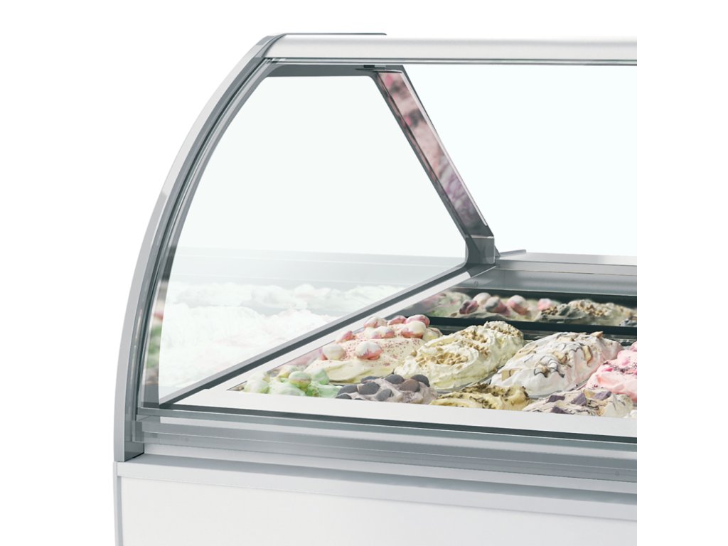 Stylový design: Oblé sklo poskytuje moderní a atraktivní vzhled, který zaujme každého zákazníka. Vaše zmrzlina bude prezentována v tom nejlepším světle.