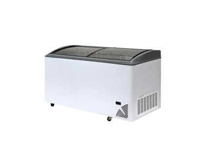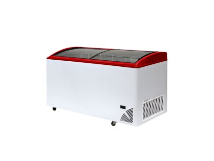 Minimalistický kolos! Mrazák 420 l s oblým sklem. 6 košů, zámek, kolečka. Pro dominantní a perfektně organizovaný prodej ve velkém!
