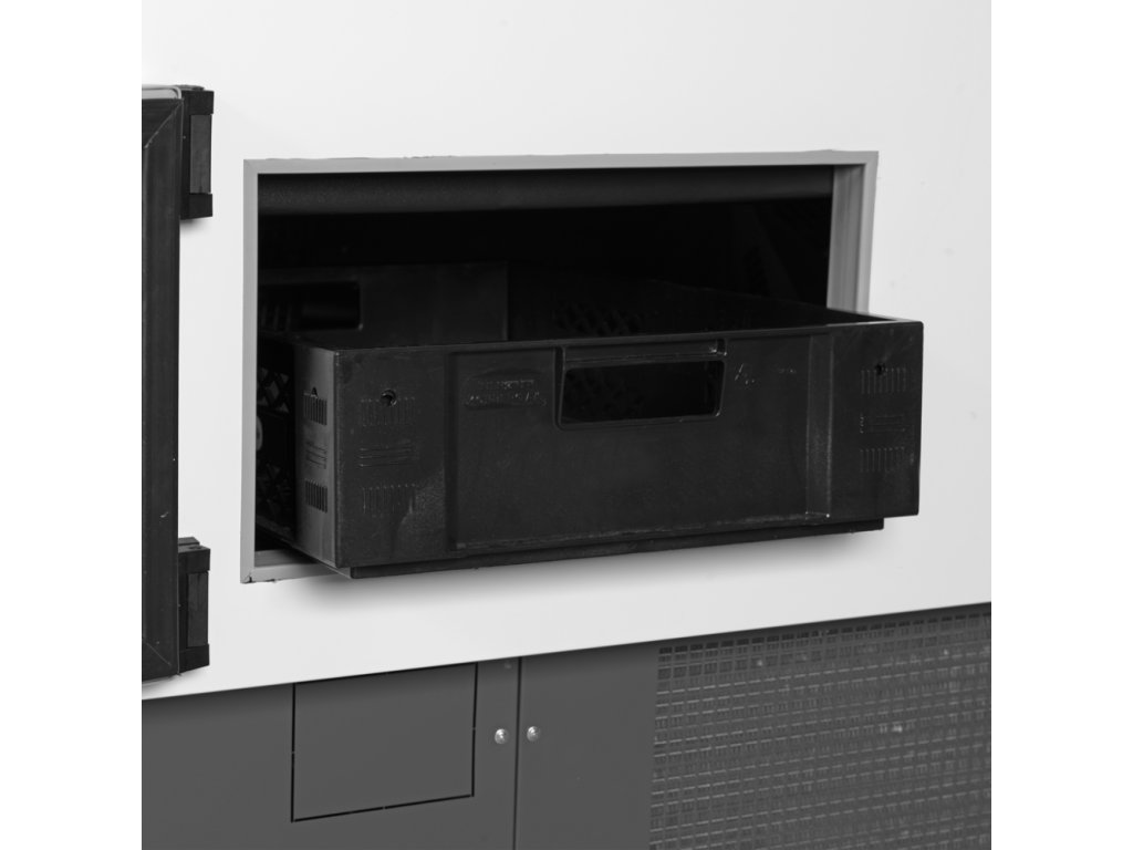 - Efektivní úložný prostor: Pod výstavní plochou se nachází snadno přístupný chlazený skladovací prostor se širokými dveřmi, navržený pro standardní přepravky E2.