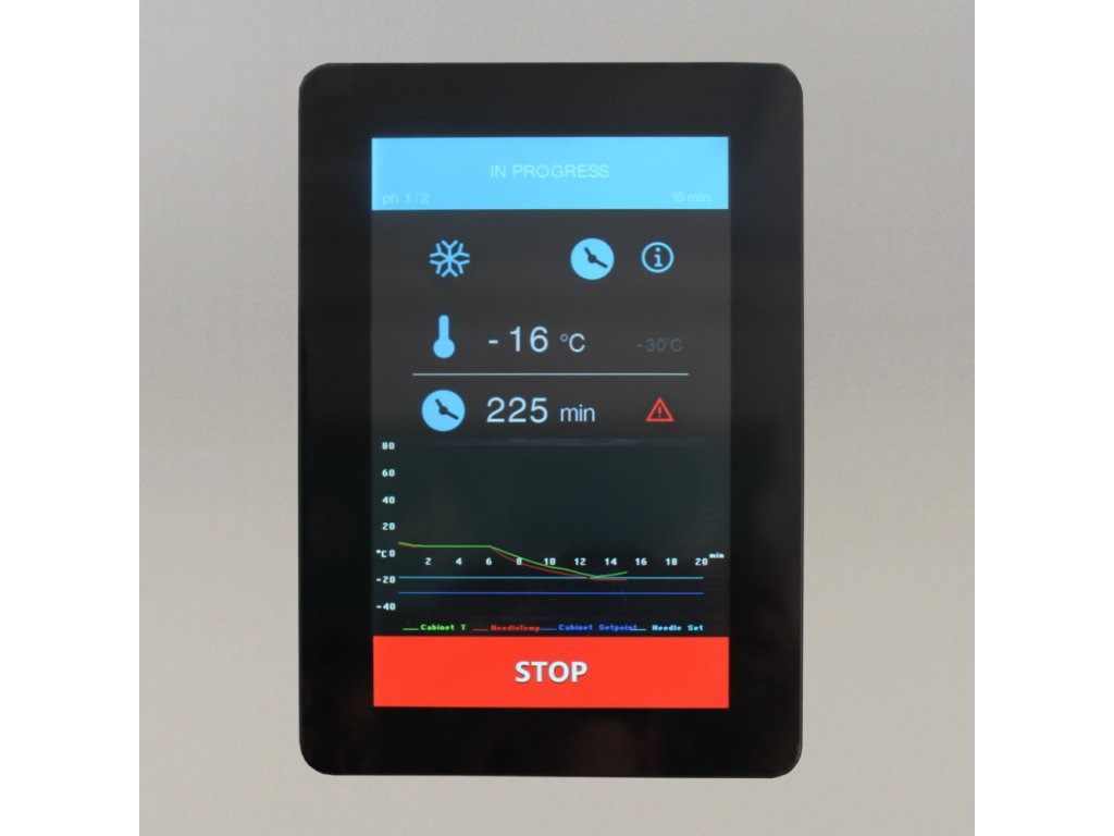 Kombinovaný šokový zchlazovač a zmrazovač s dotykovou obrazovkou. Kapacita 5 GN1/1, teplotní rozsah -18 až +70 °C. Nerezové provedení.