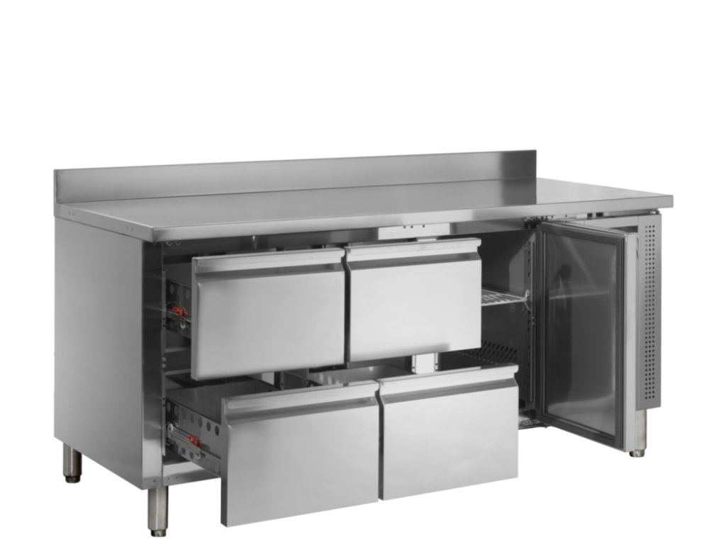 Velkokapacitní chladicí stůl (402 l) pro maximální organizaci. 4 šuplíky pro rychlý přístup + 1 dveře pro objemné suroviny. Deska s lemem.