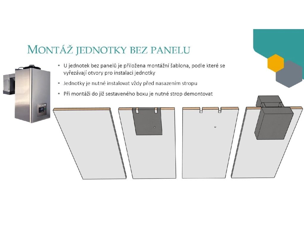 - Jednoduchá instalace: Mrazicí jednotka se upevňuje zvenčí panelového mrazicího boxu vsazením do připraveného obdélníkového otvoru. Instalace je rychlá a nevyžaduje speciální nástroje, stačí proříznout otvor do panelu boxu, vsadit jednotku, upevnit a připojit k elektrické síti.