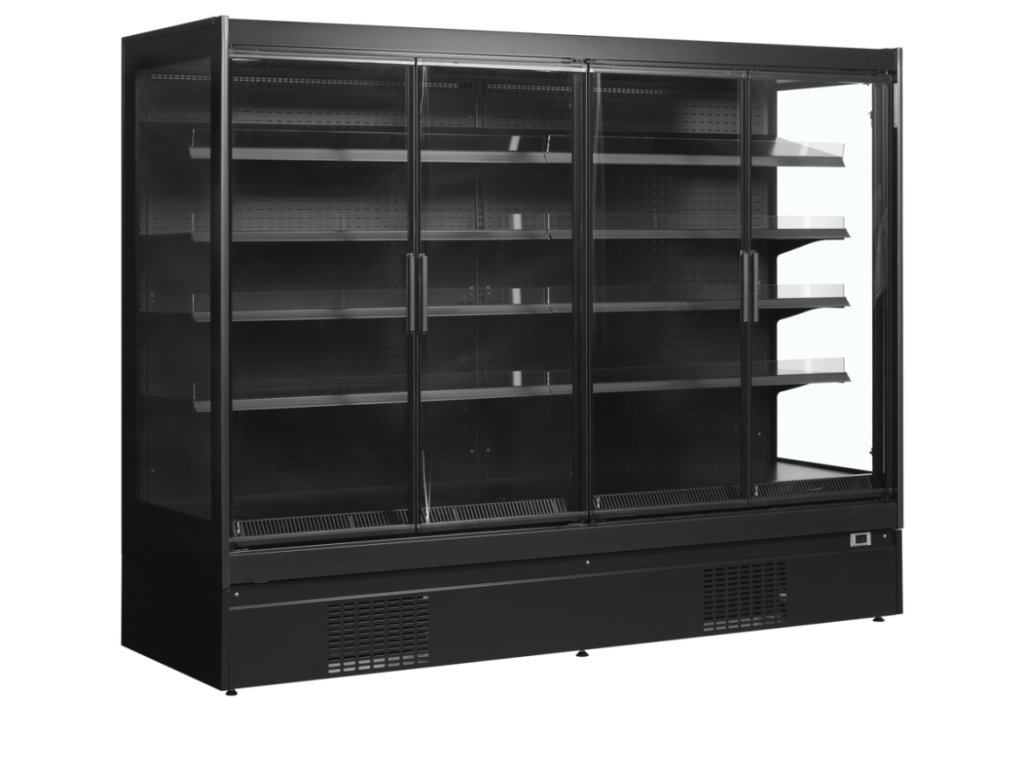 TEFCOLD EXTRA2500 CD – Přístěnná chladicí vitrína, 4-křídlové dveře, šířka 260 cm, černá