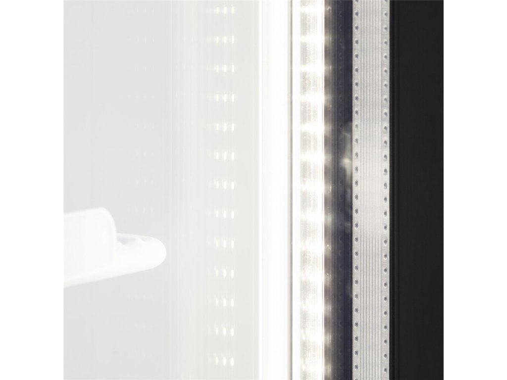 Čistý design: Tento model nemá reklamní nástavbu záměrně. Jeho čistý design a dvě velké, samozavírací křídlové dveře poskytují ničím nerušený pohled na to nejdůležitější – vaše produkty. Intenzivní vertikální LED osvětlení pak zajistí, že si jich zákazník okamžitě všimne.