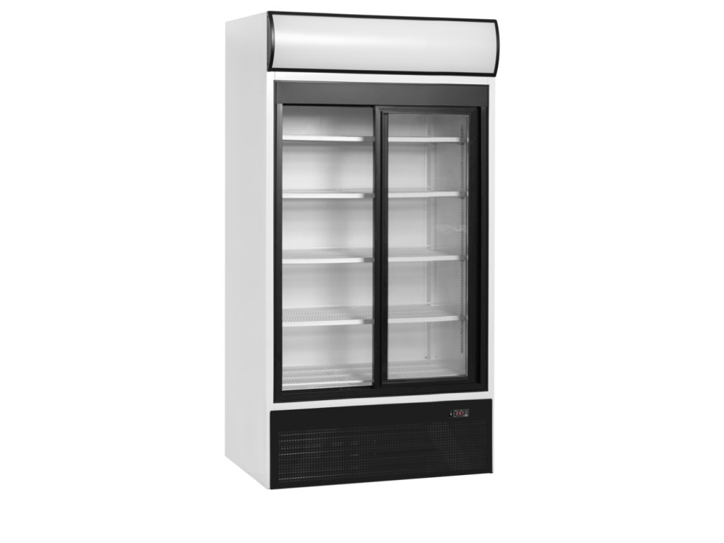 TEFCOLD FSC 1000 S – Prosklená lednice, 2-posuvné dveře, s reklamním panelem, 524 l, bílá