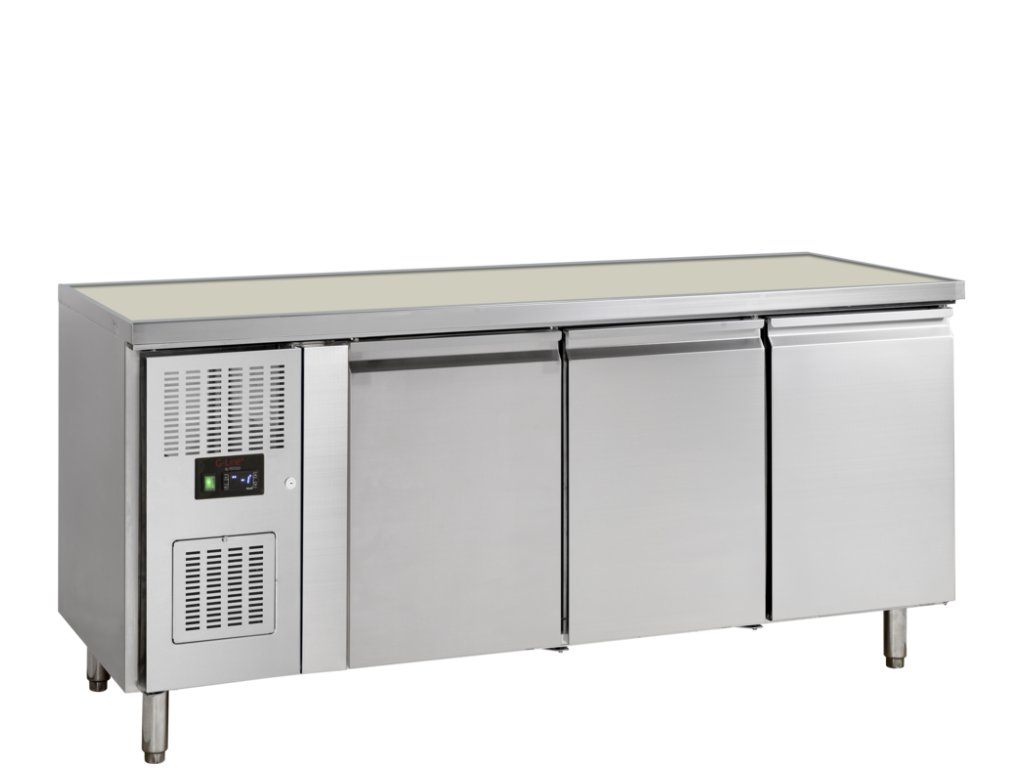Pro flexibilní design kuchyně! Třídveřový nerezový stůl (358 l) bez desky, agregát vlevo. Masivní kapacita a spolehlivý mráz (-20°C) po ruce.