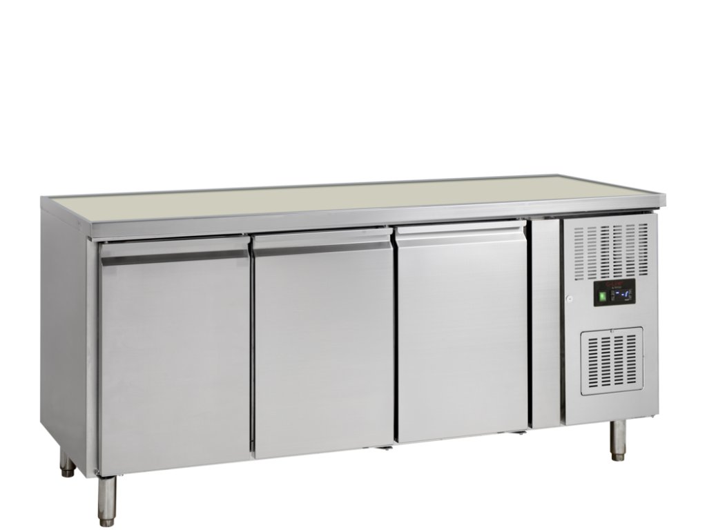 Vytvořte dokonalou pracovní linku! Třídveřový nerezový stůl (358 l) bez desky. Obrovská kapacita a spolehlivý mráz (-20°C) přímo po ruce.