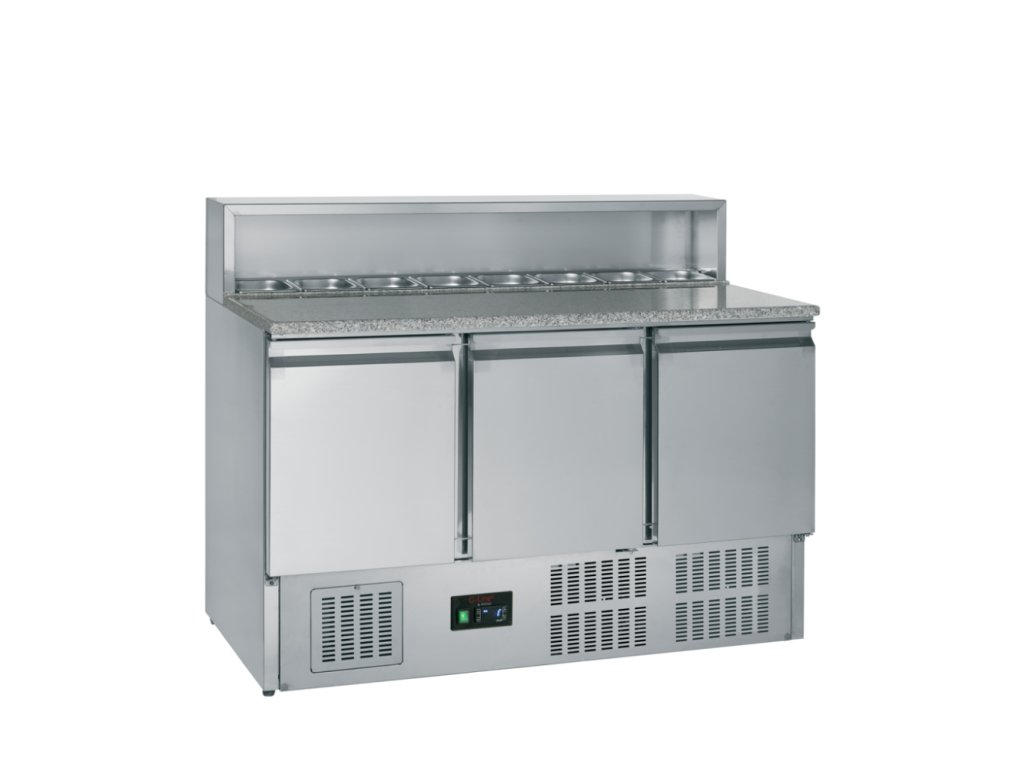 TEFCOLD GP93 – Chladicí pizza stůl, 3-dveřový, s vanou na GN 1/6, 368 l, nerezový
