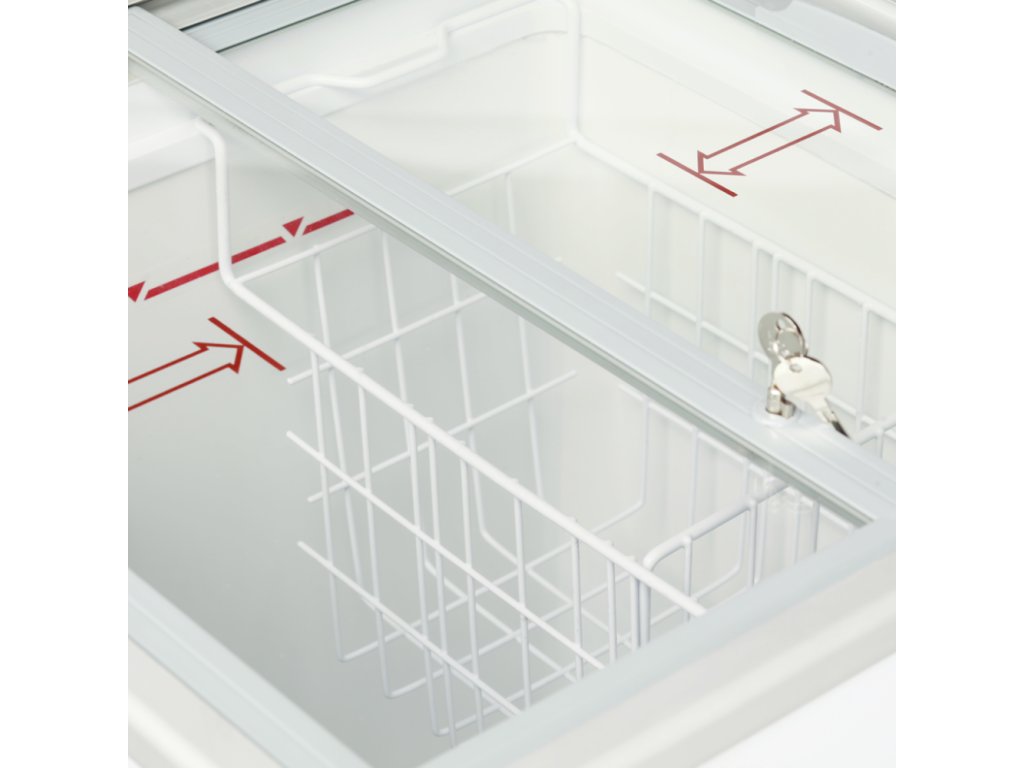 - Perfektní přehled: Dvě rovná posuvná víka poskytují zákazníkům skvělý výhled na nabízené zboží a usnadňují výběr.