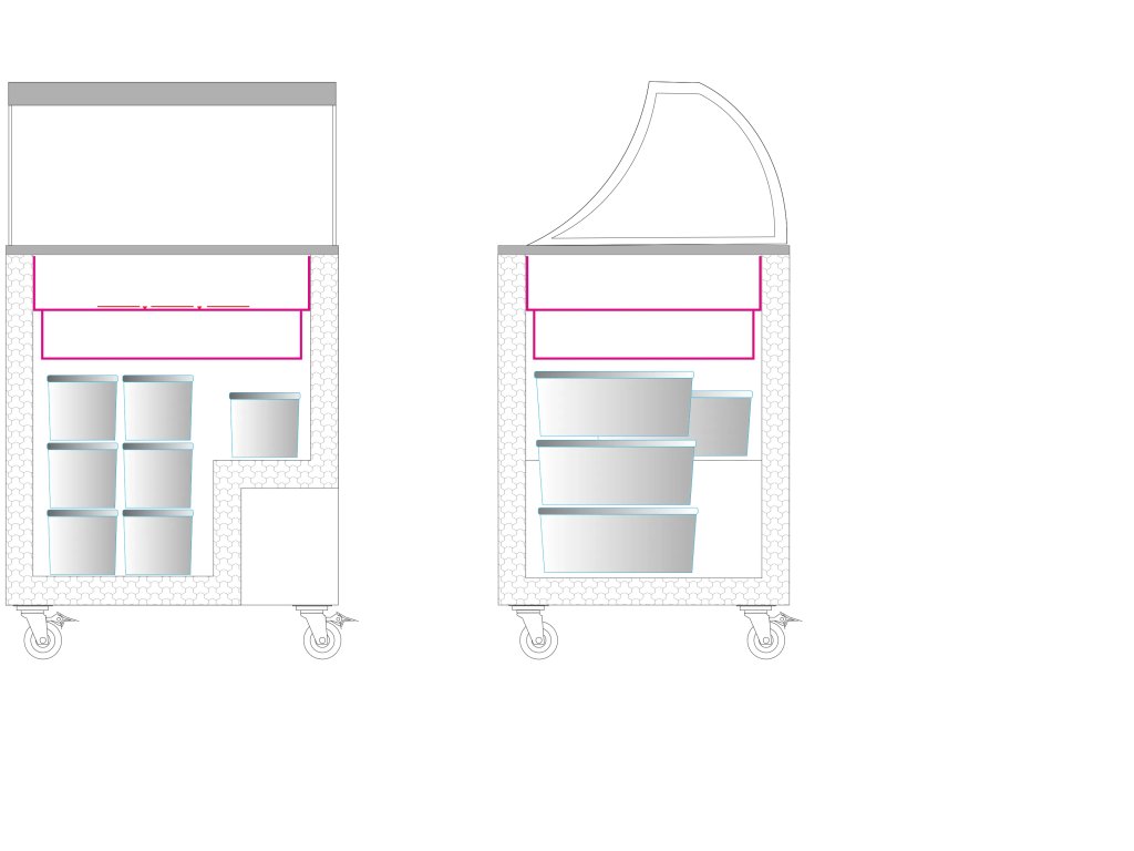 Lákavá prezentace Sestava chytře kombinuje to nejlepší z obou světů. Horní nástavba s elegantním oblým čelním sklem poskytuje zákazníkům perfektní výhled na nabízenou zmrzlinu. Obsluha má přitom snadný a rychlý přístup ke zboží přes rovná posuvná prosklená víka základního mrazáku.