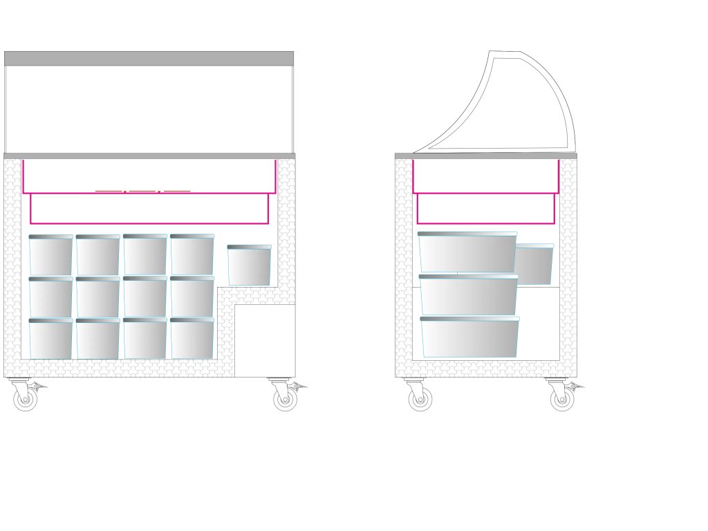 Lákavá prezentace Sestava chytře kombinuje to nejlepší z obou světů. Horní nástavba s elegantním oblým čelním sklem poskytuje zákazníkům perfektní výhled na nabízenou zmrzlinu. Obsluha má přitom snadný a rychlý přístup ke zboží přes rovná posuvná prosklená víka základního mrazáku.