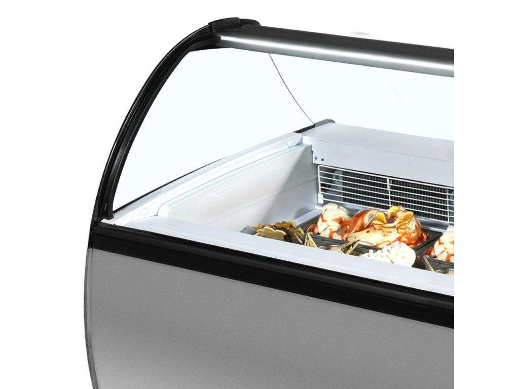 Elegantní design Klasické oblé přední sklo a zářivé vnitřní LED osvětlení dávají vyniknout přirozeným barvám zmrzliny a přitahují pohledy zákazníků.