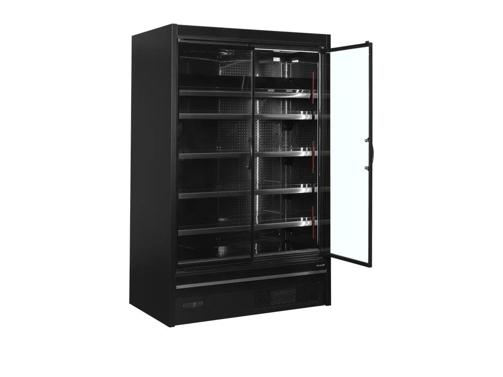Maximalizujte prodeje! Velkokapacitní černá vitrína TEFCOLD s úspornými dveřmi a LED. Dominantní prvek pro moderní obchody a supermarkety.