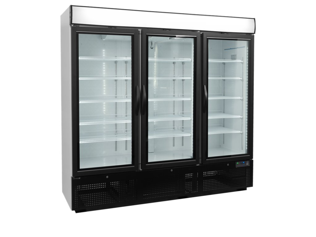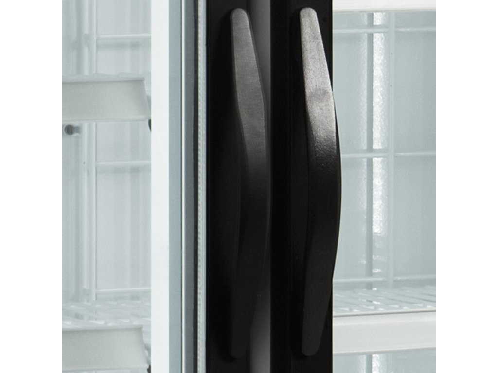 Prosklené dveře s vyhříváním: Tři samo zavírací prosklené dveře umožňují snadný přístup k obsahu mrazicí skříně a zároveň minimalizují únik chladného vzduchu. Vyhřívání skla zabraňuje kondenzaci a zajišťuje vždy jasný pohled na uložené produkty.