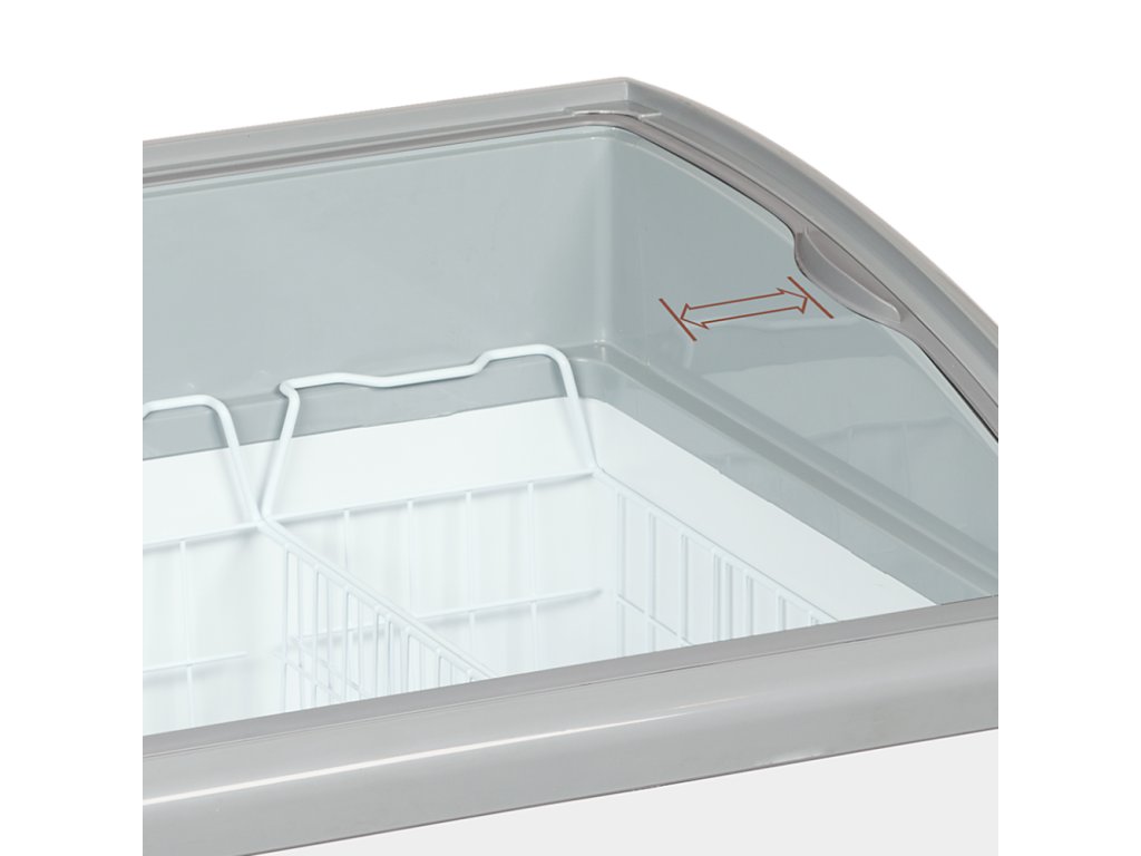 - Perfektní prezentace: Kombinace dvou oblých prosklených vík a nakloněné výstavní plochy vystavuje zboží přímo do zorného pole zákazníka a láká k nákupu.
