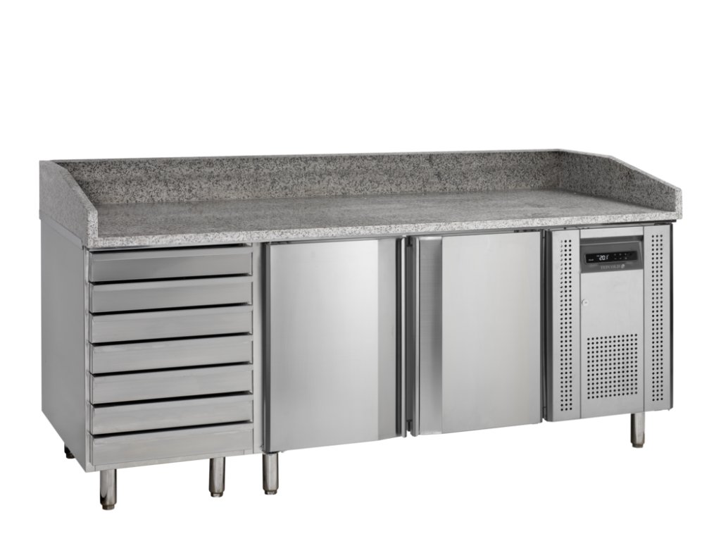 Ekosystém pro pizzaiola (370 l). Žulová deska, 7 šuplíků na těsto + 14 zásuvů pro plechy v chladu. Naprosto plynulý a rychlý pracovní proces.