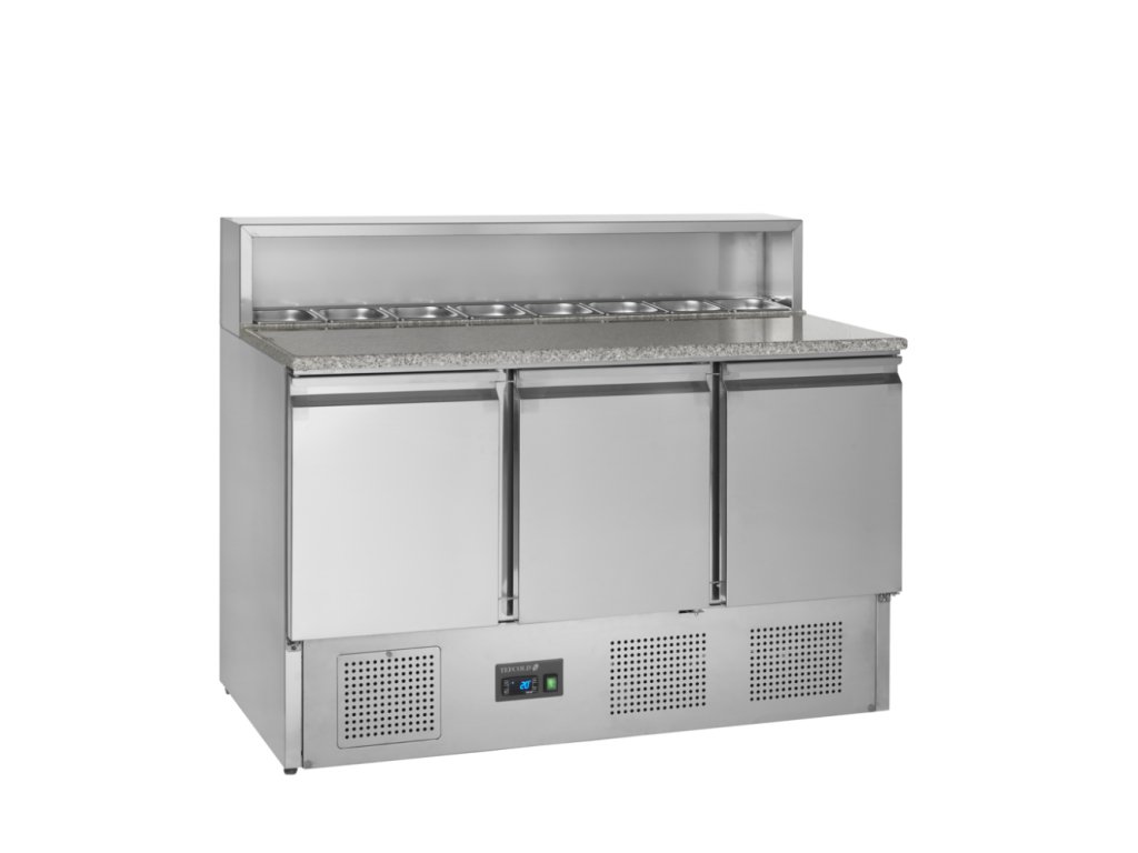TEFCOLD PT 930 - Třídveřový nerezový chladicí pizza stůl s prostorem pro GN 1/6 (368 l) + mikrovlnná trouba zdarma