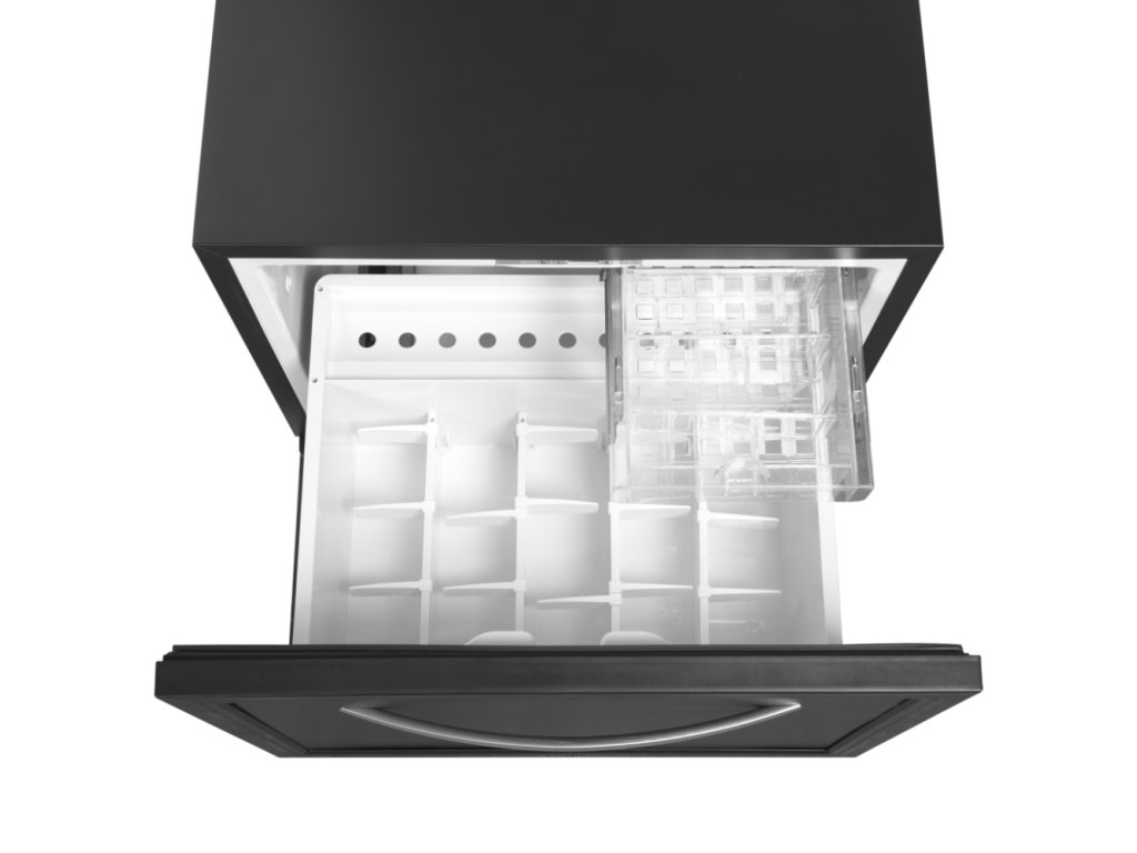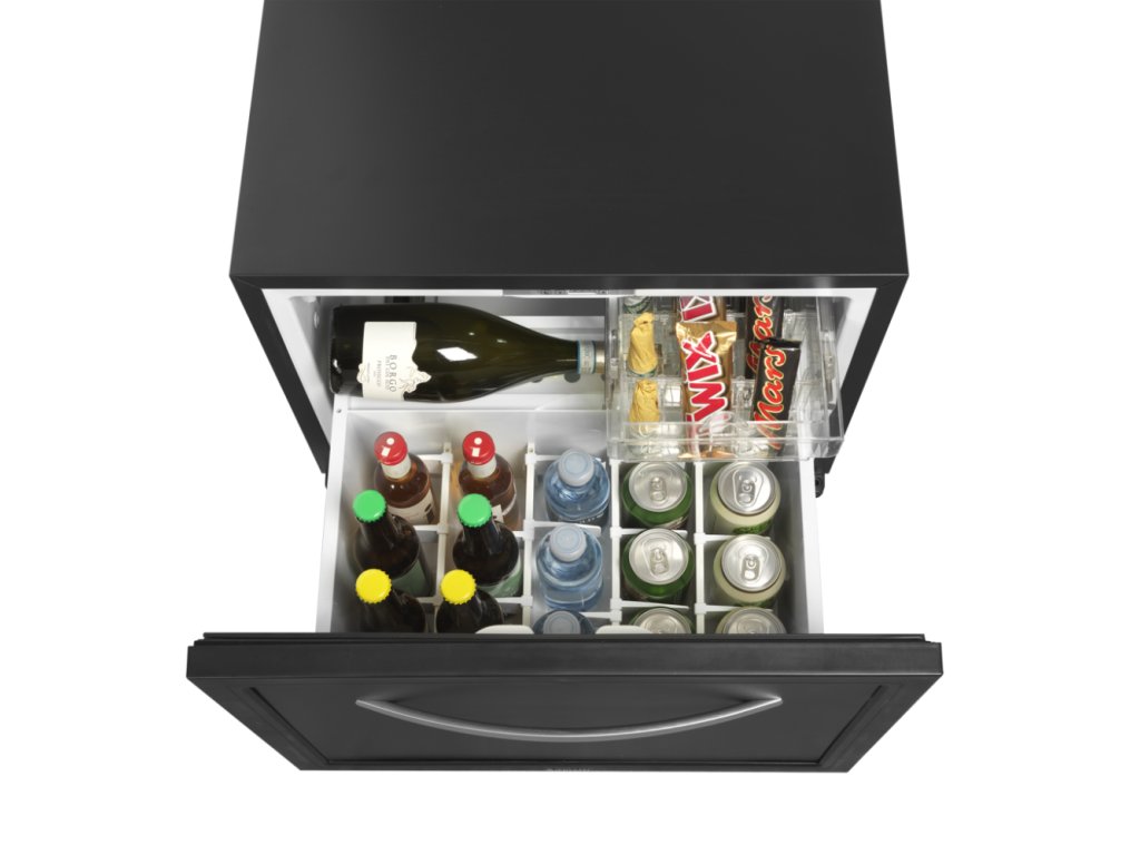 Elegantní zásuvkový minibar (45 l) pro moderní hotely. Luxusní pohodlí a dokonalý přehled o obsahu. Absolutně tichý a úsporný provoz.