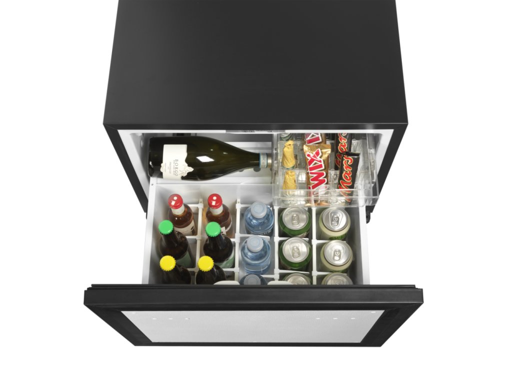 Tichý zásuvkový minibar (45 l) pro maximální pohodlí hostů. Elegantní design, LED osvětlení a úsporný provoz. Dokonale splyne s interiérem.