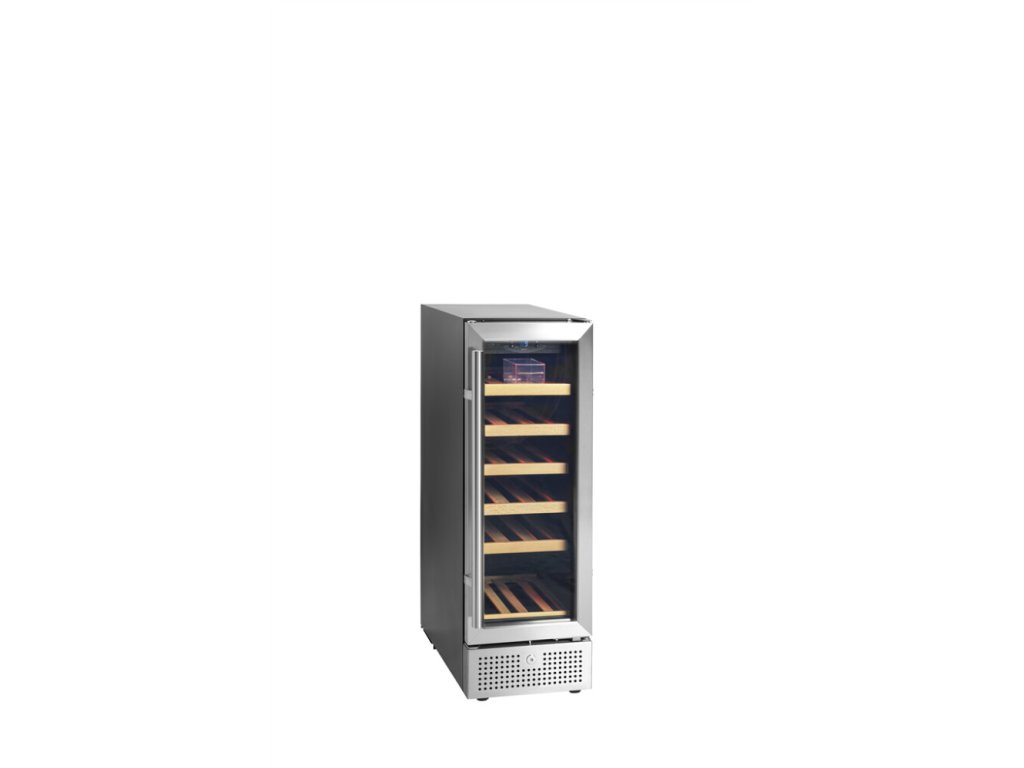 Štíhlá designová vinotéka pro 19 lahví. Díky tichému provozu ideální do bytu či kanceláře. Dřevěné police, zámek a elegantní nerezový rám pro styl a bezpečí vaší sbírky.