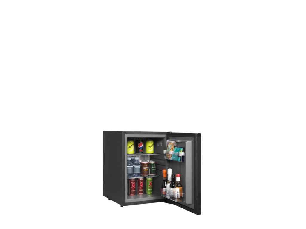 Tichý absorpční minibar (34 l) s LED osvětlením a zámkem. 2 nastavitelné police. Elegantní a úsporné řešení pro hotely a kanceláře.