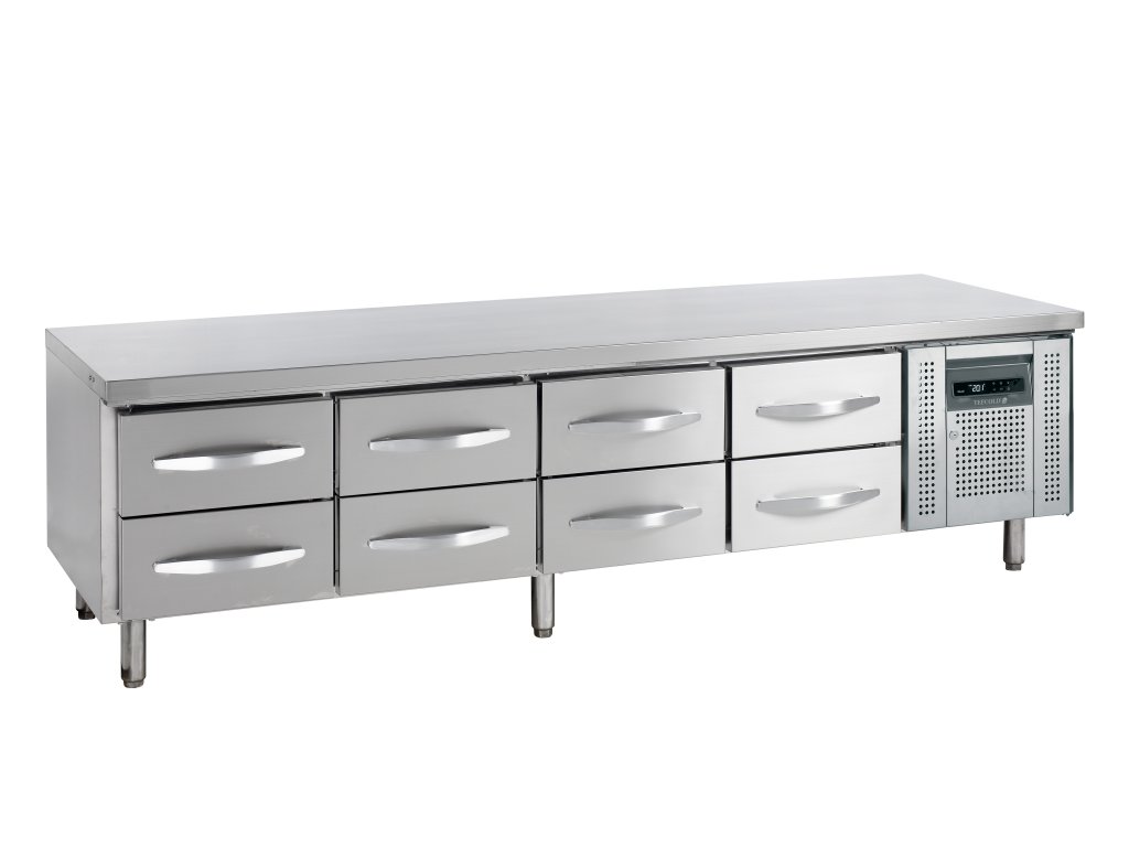 Obří základna pro nejnáročnější. Unese celé varné linky a v 8 zásuvkách GN 1/1 udrží obrovské množství surovin perfektně zchlazených a okamžitě dostupných.