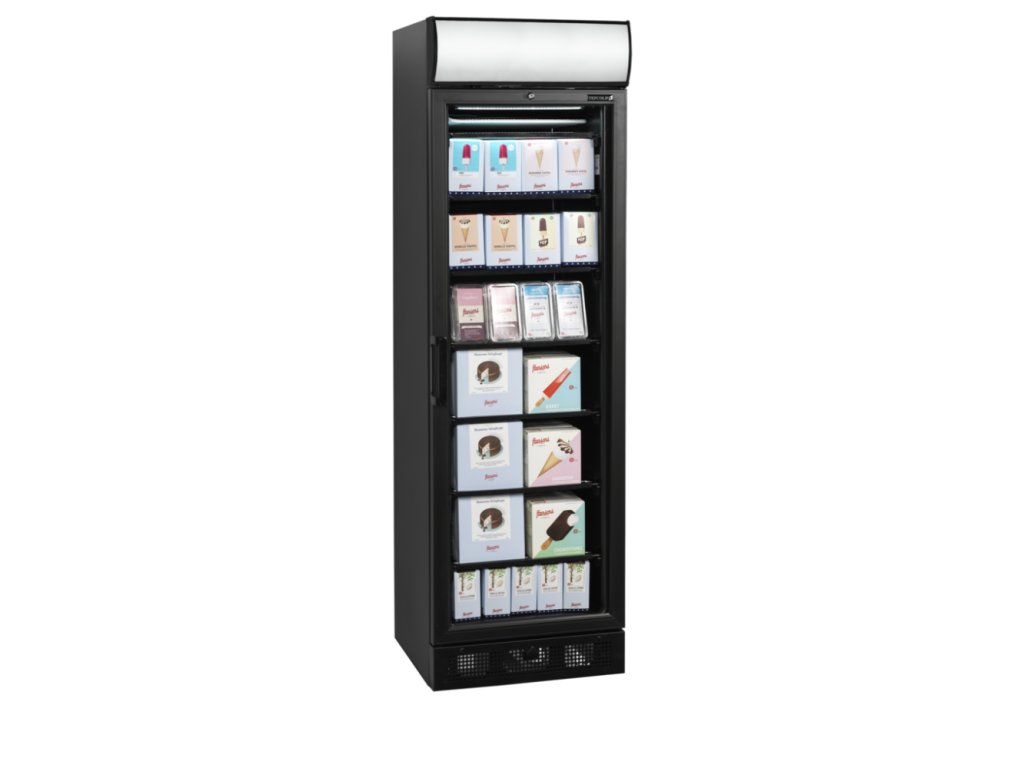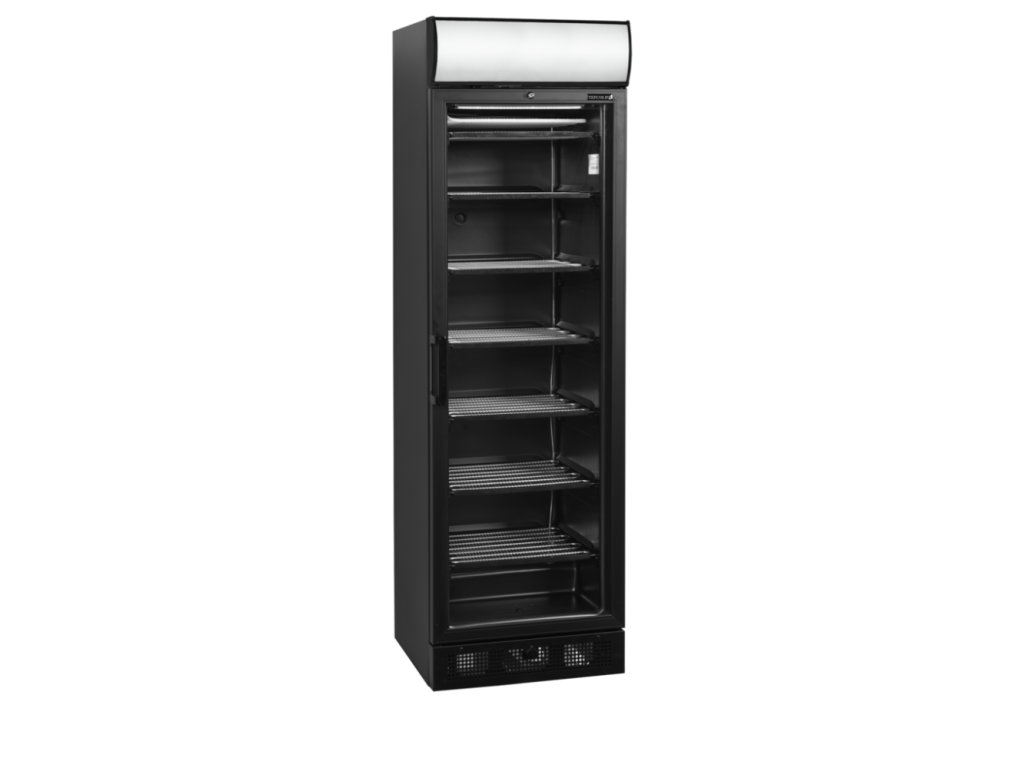 TEFCOLD UFSC371GCP Black – Mrazicí vitrína, 1-dveřová, statické chlazení, s reklamním panelem, 270 l, černá