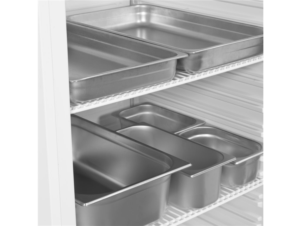 Univerzální široká lednice v praktickém bílém provedení. Navržena pro efektivní skladování přepravek (např. E2) i gastronádob standardu GN 2/1. Úsporný a spolehlivý provoz.