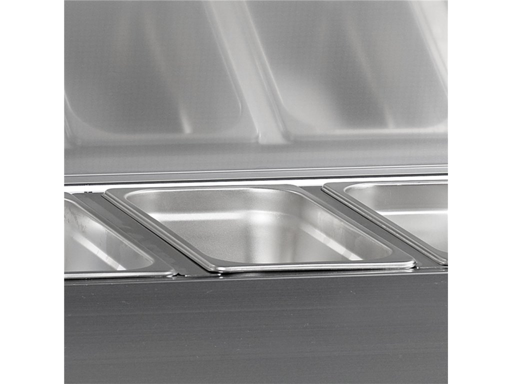 Maximální kapacita Prostor pro 8 gastronádob velikosti GN 1/3 (nejsou součástí) poskytuje obrovské místo pro uskladnění kompletního sortimentu ingrediencí přímo na pracovní ploše.